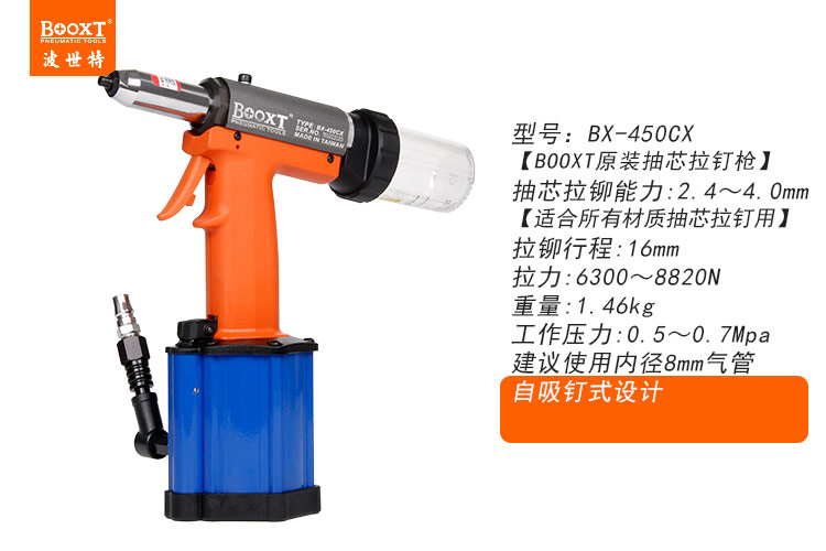 東莞市強勁五金工具有限公司提供臺灣BOOXT波世特品牌氣動工具,自吸釘氣動拉鉚槍BX-450CX廠家直銷,首件享特價。咨詢熱線:4008301980