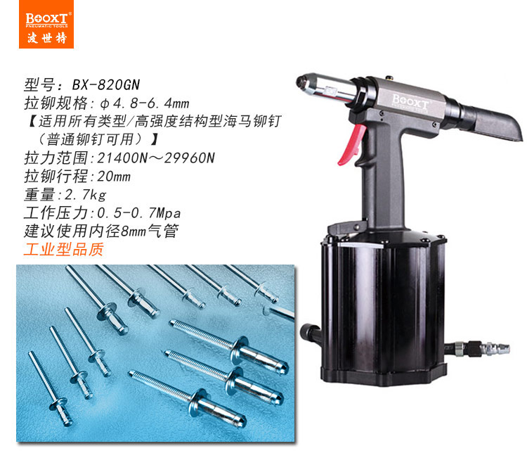 東莞市強勁五金工具有限公司提供臺灣BOOXT波世特品牌氣動工具,氣動海馬鉚釘槍BX-820GN廠家直銷,首件享特價。咨詢熱線:4008301980