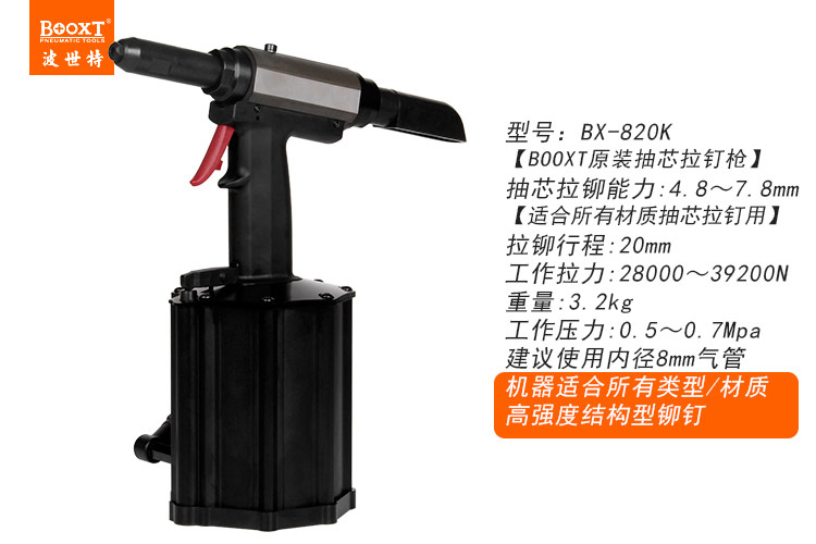東莞市強(qiáng)勁五金工具有限公司提供臺(tái)灣BOOXT波世特品牌氣動(dòng)工具,7.8氣動(dòng)拉鉚釘槍BX-820K廠家直銷,首件享特價(jià)。咨詢熱線:4008301980