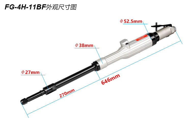 • 產品參數: 夾頭能力:M3,6,8 【標配M6】 馬達功率:0.99HP 空載轉速:12000rpm 全 長:646mm 桿 長:270mm 桿 直 徑:27mm 重 量 : 2.5kg 耗 氣 量:0.8m3/min 【工業型/大馬力/扳機開關】