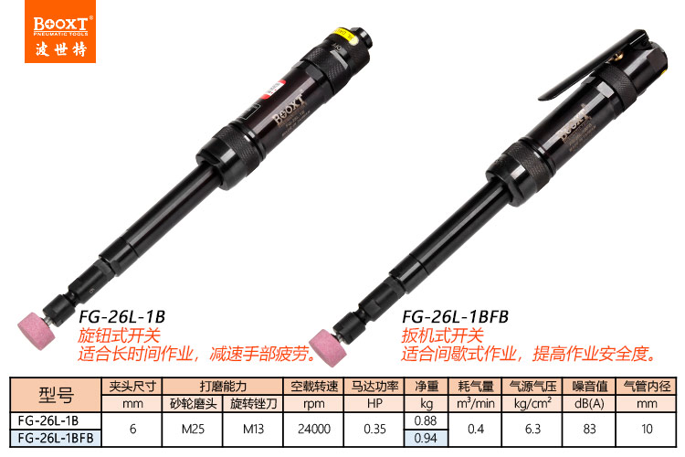 東莞市強勁五金工具有限公司提供臺灣BOOXT波世特品牌氣動工具,高精密氣動風磨機FG-26L-1BFB廠家直銷,首件享特價。咨詢熱線:4008301980
