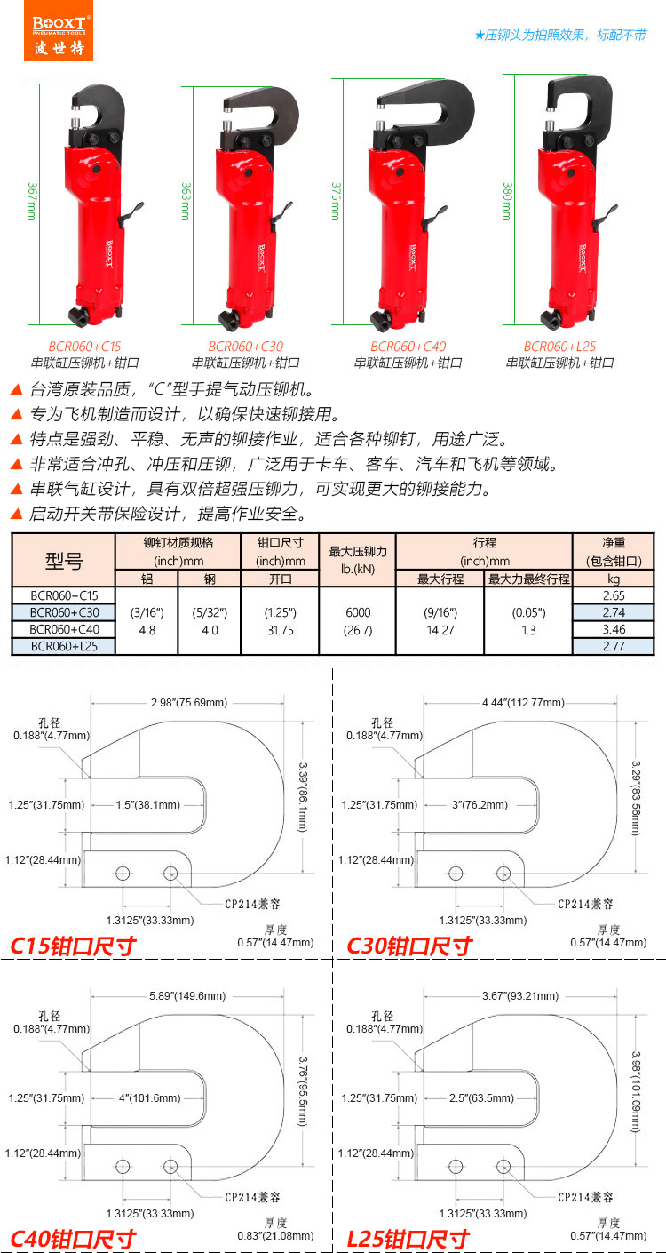 東莞市強勁五金工具有限公司提供臺灣BOOXT波世特品牌氣動工具,C式氣動壓鉚鉗機BCR060+C40廠家直銷,首件享特價。咨詢熱線:4008301980