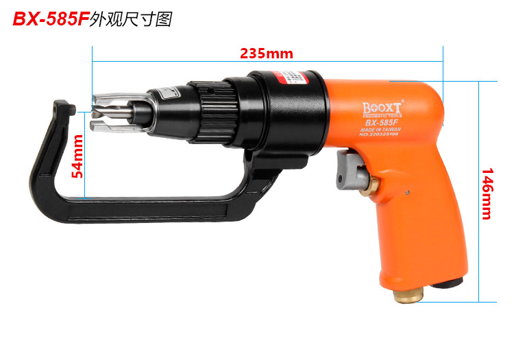 • 產品參數: 夾頭尺寸:M8 空載轉速:1000rpm 全 長:235mm 重 量:2.06kg 耗 氣 量:0.55m3/min 【專業型/低速強力型】