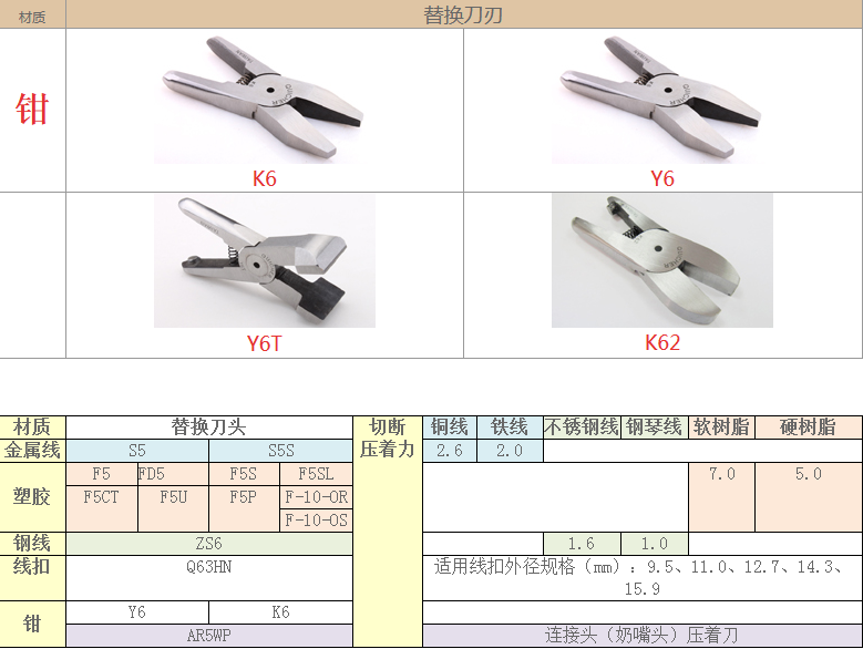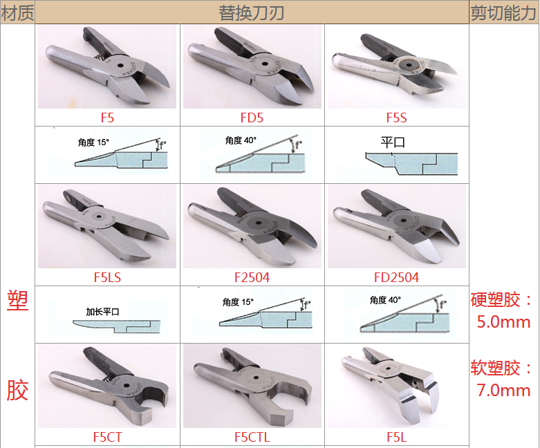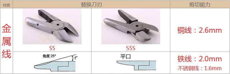 2.注意材質:材質對選配刀刃非常重要,例如客戶要剪的銅鐵、材質有鍍鈦、鍍烙、塑料材質、加纖維超過20% 時,一般刀刃不是剪不斷,就是使用壽命大大減少,塑料還容易在剪斷過程中碎裂。在這情形S刀刃應選擇Z刀,塑料則建議使用電熱剪。