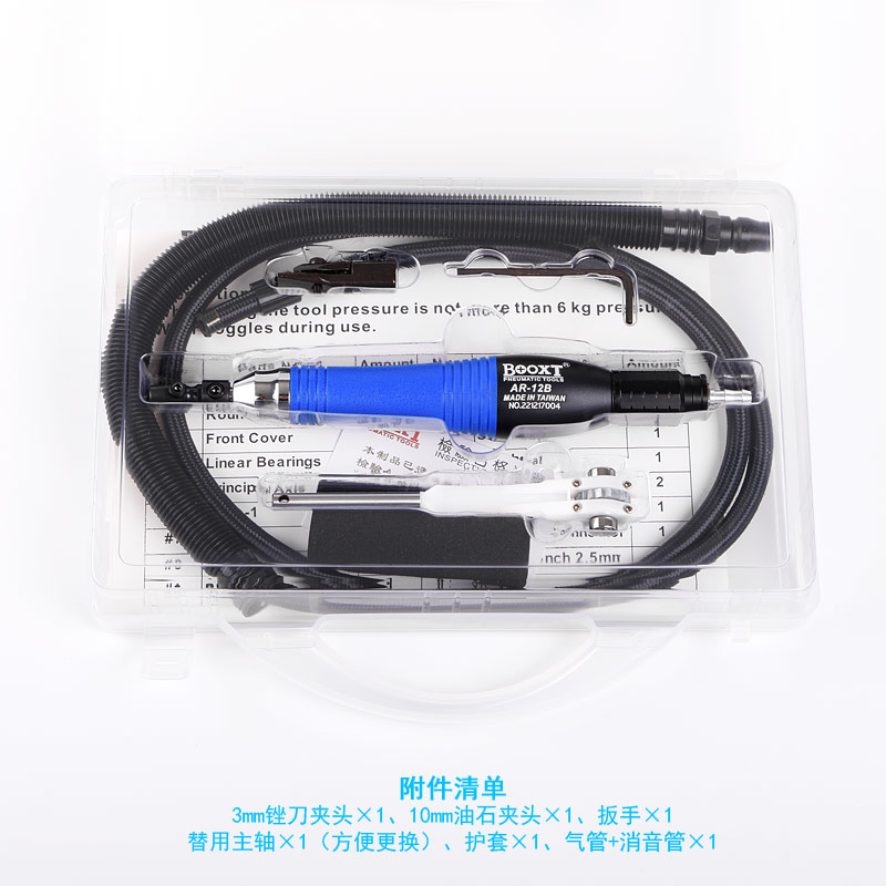• 產品參數: 夾頭尺寸:3mm;行程:1.2mm;沖程數:25000bpm;長度:200mm;重量:0.2kg;耗氣量:0.21立方米/分鐘;推薦氣管尺寸:6.5mm